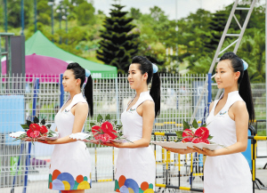 本屆大運(yùn)會(huì)共有350名從全國(guó)各地海選而來(lái)的頒獎(jiǎng)禮儀志愿者,包括290名女生和60名男生。昨天,觀眾在13個(gè)場(chǎng)次的頒獎(jiǎng)儀式中領(lǐng)略了他們的風(fēng)采。大運(yùn)期間,他們將在32個(gè)決賽場(chǎng)館舉行的306場(chǎng)頒獎(jiǎng)儀式中頒發(fā)2000多枚獎(jiǎng)牌。