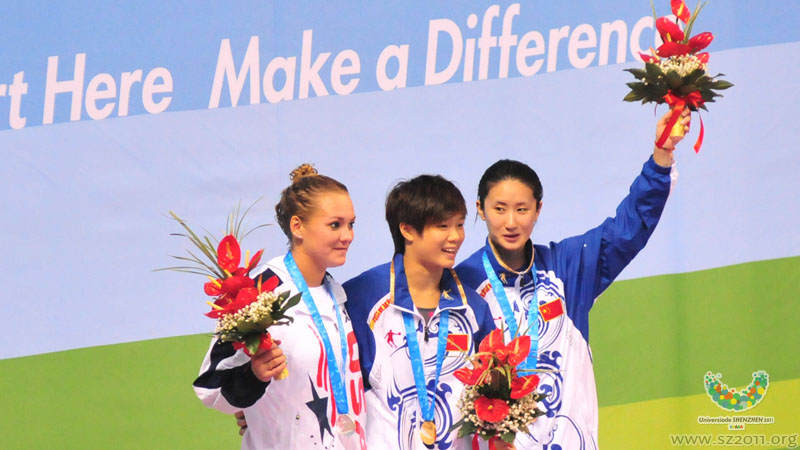 8月16日,第26屆世界大學生運動會女子1米跳板獎儀式在深圳游泳跳水館舉行,中國選手施廷懋(中)獲得金牌,美國選手布賴恩特(左,BRYANT Kelci)獲得銀牌,中國選手陳燁(右)獲得銅牌。大運會官方圖片社 廖俊鴻 攝