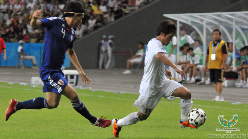 8月18日,在第26屆世界大學(xué)生運(yùn)動(dòng)會(huì)男子足球1/4決賽中,中國隊(duì)以2比3負(fù)于日本隊(duì)。圖為中國隊(duì)球員李勛(右)在比賽中進(jìn)攻。(大運(yùn)會(huì)官方圖片社 李文 攝)
