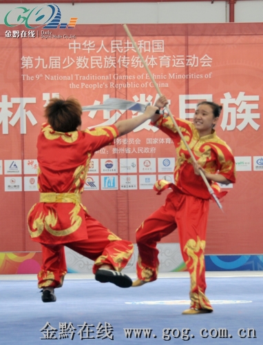 9月14日上午,第九屆全國(guó)少數(shù)民族傳統(tǒng)體育運(yùn)動(dòng)會(huì)武術(shù)男子、女子對(duì)練項(xiàng)目分別在貴陽(yáng)開(kāi)賽,共有男子12對(duì)、女子5對(duì)參賽。