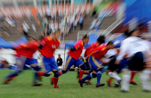 9月14日,貴州隊(duì)隊(duì)員(紅)在比賽中掩護(hù)進(jìn)攻。當(dāng)日,在第九屆全國少數(shù)民族傳統(tǒng)體育運(yùn)動會花炮比賽中,北京隊(duì)以6比1戰(zhàn)勝貴州隊(duì)。新華社 記者 焦衛(wèi)平 攝