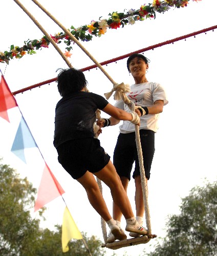 2007年11月14日,吉林隊朝鮮族選手劉洋(右)/崔相玉在第八屆全國少數民族傳統體育運動會秋千55公斤以上級雙人高度決賽中,奪得冠軍。新華社記者楊宗友攝
