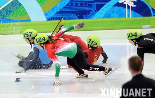 2月20日,中國選手王濛(右二)在比賽中摔倒。當日,在溫哥華冬奧會短道速滑女子1500米半決賽中摔倒,無緣決賽。新華社記者 楊磊 攝
