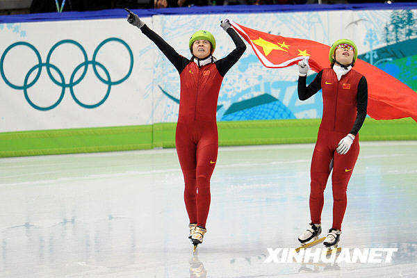 2月26日,在溫哥華冬奧會短道速滑女子1000米決賽中,中國選手王濛以1分29秒213的成績奪得冠軍。這是王濛(左)奪冠后與隊(duì)友周洋手持國旗慶祝。新華社記者楊磊攝