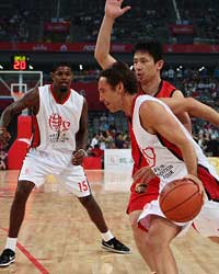 納什精彩的表演第二節仍在繼續,見縫插針的上籃仿佛讓現場觀眾回到了NBA 的賽場。在距半場比賽結束還有5分28秒時,納什突破后將球隨手向籃板拋去,他的本意是與已經在籃下的塔比特完成一次空中接力,但球鬼使神差的直接打板后進入籃筐。這個鏡頭也讓現場爆發出了巨大的喝彩聲。