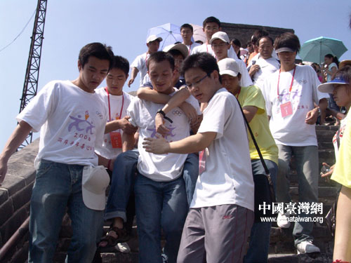 中國臺灣網8月22日北京消息 “我終于成為好漢了!”臺灣大學社工系學生胡翔淳因腦麻痹患上了運動神經元病,導致行動不便,但堅強的他自幼便有一個登上長城成為好漢的夢想,昨天在眾多大陸同學的幫助下終于登上了長城,并和同學們一起高聲呼喊。