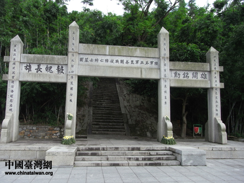 17日清晨,參加“情系八桂”活動的兩岸文化界人士來到昆侖關戰役遺址前,向為國捐軀的先烈們致敬。在紀念牌坊下,兩岸文化界人士肅穆地向英烈們獻上一枝枝黃菊花。