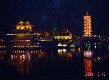 游客日夜可乘船游環(huán)城飽覽桂林秀色,那些島嶼、綠樹、亭臺(tái)水榭、曲橋銜引、湖光山色在奇幻彩光下,變得色彩斑斕,撲朔迷離,月光、燈光與實(shí)景,渾然一體,四湖成了人間仙境。