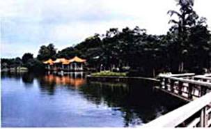 與滿山青翠的樹木相映襯的是山腰上天池和瑤池這兩個巨大的人工湖。天池面積達15000平方米,水深2—3米,池水波光粼粼,青松翠柏、藍天白云倒影水中。池中小島建有宜棲亭和盼鵲亭,微風輕拂,正是上得山來的游人歇息的好去處。瑤池位于供有壯族女神洛甲、聰明女神布劣陀和勇敢之神布伯三尊石神像的佛堂“三寶堂”東邊,面積有5000平方米,池中立有王母娘娘塑像2座,東沿岸的花崗巖青石上刻有八仙聚會瑤池的浮雕圖,形態(tài)栩栩如生。池周圍種有一片桃林,游人若是春天到此游玩,便可觀賞桃花盛開的美景。天池和瑤池,加上滿山翠木,使青秀山成為一個巨大的天然空氣調(diào)節(jié)器,成為南寧市區(qū)呼吸新鮮空氣的“巨肺”。