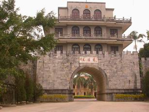 關(guān)樓底座上原來只建有一層木結(jié)構(gòu)回廊,重建時改用鋼混結(jié)構(gòu),并加了兩層回廊,每層回廊平均為80平方米。回廊的四周是拱形大窗,窗欞裝飾了各式圖案,外墻為墨綠色石米貼面,顯得莊嚴(yán)、古樸。