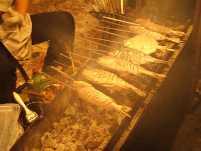 先把活魚現(xiàn)挑、現(xiàn)殺,破開兩半,上碳爐猛火烤成半干,刷油和調(diào)味料,文火慢烤,其間就向普通燒烤一樣,刷上點鹽水,烤到需要的程度時用鐵盤放上開胃的配菜,將烤好的魚放置其上,加料燜幾分鐘。然后放在已經(jīng)燃好的碳爐上面就可以上桌了。就著小酒,一口魚一口酒,那個滋味啊!真是人生一大快樂的事情!