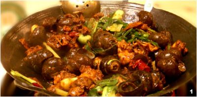 螺分田螺、食螺,田螺較食螺為大,風味小異,做法大同:將洗凈掐尾的活螺配蒜泥姜末豆豉紫蘇辣椒等,炒至熟后加入(豬骨)湯中同酸筍腐竹豆腐碌一起熬煮。至雜香貫鼻時即可趁熱食用,螺肉鮮甜可口,酸筍津辣開胃,腐竹與豆腐碌豆香飄飄,螺湯更是匯集螺豉椒筍竹的鮮甜酸辣香,美味無窮!