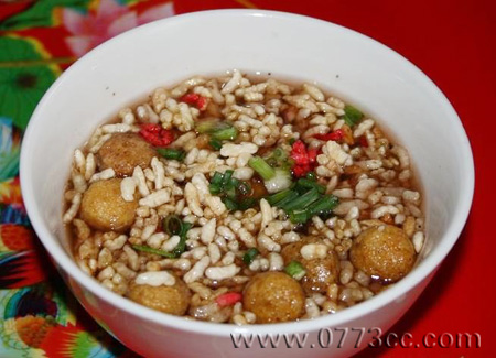 喝油茶必須配以各種佐食的小吃,都是各種油炸和炒香的食品。苗、瑤、侗等少數民族地區佐食多半是炒黃豆、炒花生米、爆玉米、炸花生米,再則就是糯米飯團或糯米粉糍粑。恭城平樂一帶縣城佐食則較為考究,酥炸小吃往往在十數種以上,請客人喝油茶往往擺上一桌子的小吃,看起來就像請客吃飯。侗族以油茶敬客是一種禮節,主人雙手捧茶敬客,并說些謙恭的話,善歌者還以歌代言,客人必須喝完兩碗,才算給主人面子,也是取“好事成雙”之意。兩碗之后不想再喝,便將碗筷一并交給主人,如果只交碗不交筷,則表示還想繼續喝,主人就高高興興地再斟滿一碗油茶送到客人手里,幾鍎t在第一、二碗送來時不送筷子,并將米花、炒豆之類的小吃加入碗里。喝完碗里的茶還留些小吃在碗底,以示有余不盡,直到喝第三碗才送上筷子,所以客人必須喝三碗以上,只喝一兩碗,主人會不高興的。