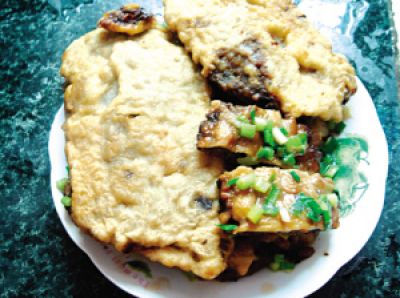 陳小姐拿出一塊正四方形的芙蓉酥說,其實剛出鍋的芙蓉酥應該是這樣的形狀。記者仔細端詳,芙蓉酥大概分兩層,上層是油炸過的面粉皮,色澤金黃,大概有0.5厘米厚;下層是混合有剁碎了的木耳、芋頭、干筍的碎肉餡,炸過后有些焦黃,看上去十分可口。陳小姐介紹芙蓉酥的做法:首先面皮得用生雞蛋來攪拌和面,蛋越多,面皮越好吃;其次碎肉餡用料也有講究,不僅要選用半肥瘦豬肉,還要添加木耳、芋頭、干筍等,這樣口感才香脆;將面皮攤上砧板后,就將做好的肉餡鋪在面皮上,接著用刀開始不停地剁,把肉餡均勻“鑲”到面皮里。這道工序很重要,它能使接下來將芙蓉酥放到油鍋里油炸時才不會散開。當芙蓉酥炸成金黃色之后即可撈起,再切成一塊塊的正四方形,即可待食。陳小姐說,芙蓉酥可以做好后馬上食用,也可以存放時間較長而不變質。想吃的時候只要拿到鍋里蒸軟就可以了,咸香可口,讓人吃了還想再吃。