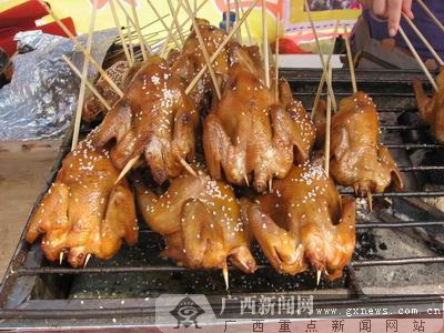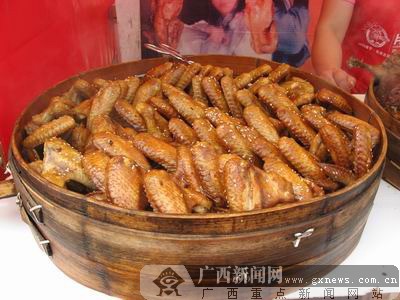 叫花雞是江蘇特產,已是名滿江南,歷史悠久。在東盟美食節上,廚師是把加工好的雞用泥土和荷葉包裹起好,用烘烤的方法置炭火上徐徐烘烤,煨熟,制作出來的一道特色菜。其色澤棗紅明亮,芳香撲鼻,板酥肉嫩,味道鮮美。