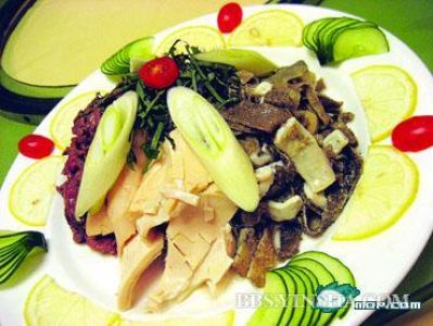 出品清淡,卻不掩本身的鮮味,清淡之中余味悠長,牛雜要的就是這份樸實。牛黃喉、牛百葉、牛筋、牛肚、牛肉等材料共聚一個大碟子里,周圍散落著紫蘇、青豆,絲毫不起眼。夾起一塊牛黃喉,牛雜特有的香味撲鼻而來,入口細嚼,一股特別的味道在口腔里蔓延。檸檬!原來在烹制時加入了檸檬,使得牛雜本身厚重濃香的味道增加了一絲俏皮的感覺,吃起來別有一番滋味。這牛雜嚼在嘴里仿如那剪不斷理還亂的糾纏,香味在口腔久久彌留。酒樓的老板介紹說,這牛雜可是添加了一種叫綠純香高級配料的,吃起來味道更加濃香,口感爽脆而不膩。而且選用的都是“不見光”牛雜,即當天凌晨牛宰殺時就取用,牛雜到廚房了太陽還沒出來,可見其新鮮。
