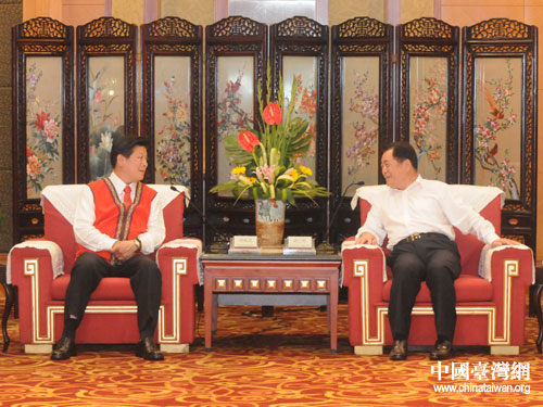 中共四川省委副書記、省長蔣巨峰(右)在成都會(huì)見來訪的臺(tái)灣花蓮縣縣長傅崐萁(左)一行。
