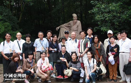 13日,情系巴蜀—兩岸文化聯誼行活動走進眉山三蘇祠。圖為臺灣嘉賓在蘇軾雕像前合影。(中國臺灣網 趙輝 攝)