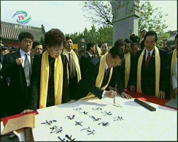 連戰(zhàn)一行于4月16日下午抵達(dá)鄭州,18日晚出席了丁亥年黃帝故里拜祖大典歡迎晚宴并欣賞拜祖大典音樂(lè)會(huì)。今天,連戰(zhàn)夫婦在中共中央臺(tái)辦主任陳云林的陪同下入場(chǎng),并為大典題字。大典開(kāi)始后,佩戴黃帝絲巾的連戰(zhàn)夫婦齊步趨前,恭敬地向黃帝像敬獻(xiàn)花籃,并凈手點(diǎn)火上香,鞠躬參拜。