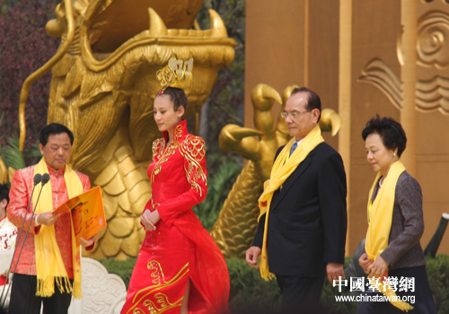11時,大典進(jìn)入祈福中華環(huán)節(jié)!安菰⑿坌〗忝谩饼埫、中國探月工程副總設(shè)計師龍樂豪、奧運冠軍鄧亞萍、中國赴海地維和警察張偉等優(yōu)秀炎黃子孫代表逐一將祈福牌掛上祈福樹,祈福中華盛世。
