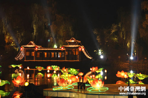 在昨天的彩排現場,以煙雨樓為背景在水中搭建的舞臺第一次盛裝亮相:亭臺樓閣依山傍水、霓虹閃爍宛如瑤臺,天上之月與水中之月交相輝映,與去年廈門“海峽月中華情” 海天一色的大場景相比,這一“舞臺連秋水、樓閣共齊飛”的舞美景觀更具含蓄秀逸的中國古典特色。