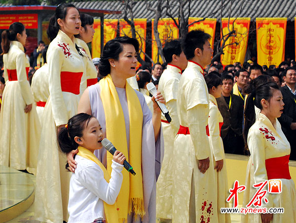 音樂響起,240名成人合唱隊、80名少兒合唱隊齊聲高唱《黃帝頌》,著名歌唱家毛阿敏與北京奧運會開幕式演唱《歌唱祖國》的童星林妙可在金色的祈福樹下,攜手領(lǐng)唱。和聲共唱、溫馨動人。