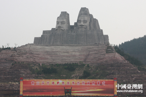 炎黃二帝石塑,目前國內最雄偉的雕塑之一。依山就勢,以山為體,以82米高的整座向陽山作為像身,再在山頂塑造18米高的頭像,總高達到100米。炎黃二帝坐南朝北,背依邙山,面對黃河。巨像前是一個開闊場地,周圍遍植松柏,中間建筑祭壇。祭壇至塑像的軸線上建有長200米的神道,兩側各列四座鑄銅大鼎,連同山前一座共九鼎,寓意九州四方江山永固。廣場東西兩端擺放大型編鐘、銅鼓各一個。(中國臺灣網 趙輝 攝)