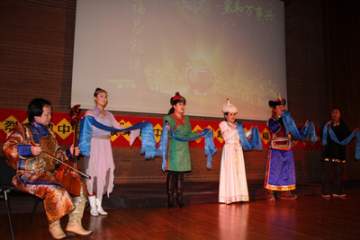 晚會上,以內(nèi)蒙古民族歌舞劇院為主的藝術(shù)家們奉獻(xiàn)了一臺匯集歌舞、器樂的高水準(zhǔn)演出,集中展示了蒙古族的草原文化與風(fēng)情,包括不少國家級非物質(zhì)文化遺產(chǎn)的獨(dú)特風(fēng)貌。演出在極具蒙古族風(fēng)情的合唱《成吉思汗》中拉開帷幕,蒙古族長調(diào)《贊歌》猶如莽莽草原連綿伸延,絕技“呼麥”恰似滔滔江水奔流翻滾; 激昂奮進(jìn)的馬頭琴弦奏出了萬馬歡騰的壯觀場面,大家耳熟能詳?shù)慕?jīng)典歌曲《美麗的草原我的家》、《草原之夜》、《敖包相會》和二胡獨(dú)奏《賽馬》和《梁祝》、雜技表演《草帽》以及柔美的蒙古族舞蹈《乳香飄》更讓觀眾為優(yōu)秀的中華文化所折服。整場演出氣氛熱烈,高潮迭起,演員觀眾互動積極,盡顯中華親情。