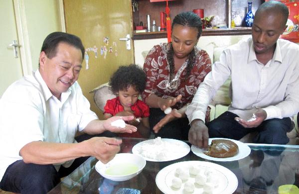 2月16日,在肯尼亞首都內羅畢,華人劉鳳臣(左一)與肯尼亞籍妻子希露(左三)及家人一起包湯圓,慶祝元宵佳節。劉鳳臣夫婦7年前成婚,每逢中國傳統節日,他們都會制作餃子、粽子、月餅等食品,并與肯尼亞朋友一起分享。 新華社記者郭倩攝