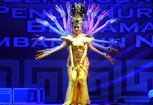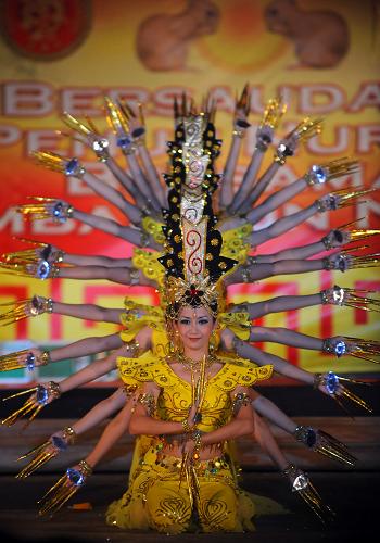 2月16日,印度尼西亞演員在山口洋市迎元宵晚會上表演“千手觀音”。
