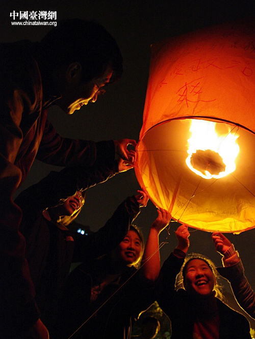 中國臺灣網(wǎng)2月16日臺北消息 臨近正月十五,全臺鬧元宵,到平溪放天燈許心愿則成為臺灣民眾在這一天最喜愛的傳統(tǒng)活動之一。天燈相傳為諸葛亮發(fā)明,亦稱為孔明燈,古時被當(dāng)作信號燈,近代已演變?yōu)槠桨布榈南笳鳌H藗兘柚従徤仙奶鞜簦谕约盒脑改苌线_(dá)天庭,無論祈求的是健康、學(xué)業(yè)、愛情,還是事業(yè)。