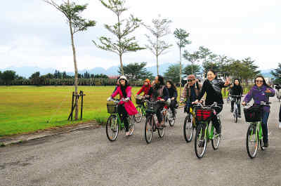 長發(fā)披肩、皮膚黝黑的導(dǎo)游阿度與我們相識在腳踏車上,我們跟隨他騎車踏訪臺東縣鹿野鄉(xiāng)的田園山水。阿度邊騎車邊指著周圍起伏的山巒說:“右手是中央山脈,翻過去就是臺灣海峽,度過海峽就是中國大陸。左邊是海岸山脈,越過去就是浩瀚的太平洋。”在果田邊,阿度興奮地喊道:“這是鳳梨、釋迦、木瓜、枇杷……都是臺灣最好吃的水果,在這里可以吃到樹上熟的水果,水多汁甜。”