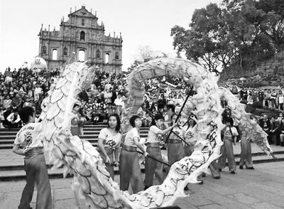 春節(jié)臨近,又有許多內(nèi)地游客計(jì)劃赴港澳旅游,每年春節(jié)澳門標(biāo)志性建筑“大三巴”前都會有傳統(tǒng)的舞龍表演。 (資料圖片)