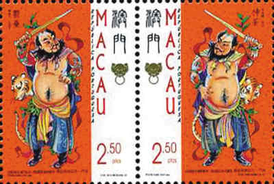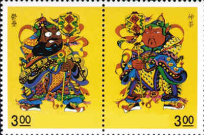 每逢過年時節,我國各地都有貼門神的風俗,希望以此驅鬼避邪、保護家人歲歲平安。最早的門神是用桃木雕刻成的兩個“桃人”,掛在門旁。據說,他們是黃帝派來統領游蕩人間群鬼的兩位神將——神荼與郁壘的化身,后來演變為直接將他們畫成門神像貼于門上。唐代以后,又有畫唐太宗的兩員大將秦瓊(叔寶)、尉遲恭(敬德)之像為門神的,屬眾多門神中的“經典搭檔”;此外,還有將關羽、張飛、鐘馗等當作門神的。門神像通常左右門戶各貼一張,成雙成對;也有把一對門神畫成一文一武的。