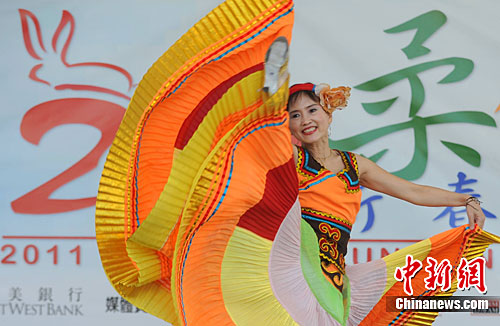 當地時間1月22日,距離農歷新年還有10來天,洛杉磯華人聚集的柔似蜜市舉辦2011年新春游園會,吸引眾多當地華人和各族裔民眾參加。圖為游園會上的華人舞蹈家表演傳統民族舞蹈。中新社發 張煒 攝