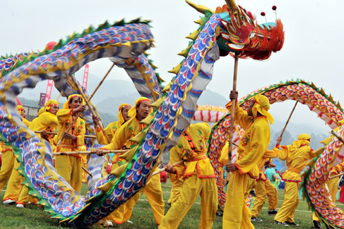 正月初九,花溪黨武鄉將以花燈、地戲、舞龍表演來歡慶節日,在桐木嶺有苗族傳統的“跳場”,燕樓鄉舊盤村將舉辦布依歌會;正月十四,在湖巢鄉下壩村,有熱鬧的布依歌會;正月十五,青巖古鎮有歡快的花燈、舞龍表演。修文六廣鎮是著名的花燈藝術村,每年這里是正月出燈,玩到元宵才肯罷燈。玩燈的隊伍少則數十人,多則幾百人。在修文街頭,從年三十到正月十五,當地的龍燈隊天天都要耍龍燈,挨家挨戶拜年。