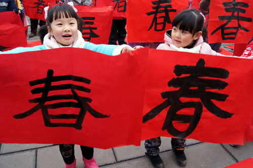 “玉兔迎春大家樂”,百名兒童現場寫春字。
