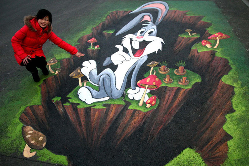2011年1月,10余名南京藝術學院學生在南京玄武湖公園的地面上創作了許多以兔子為主題的三維立體畫,迎接兔年春節的到來。1月30日,游人在南京玄武湖公園一幅三維立體畫旁拍照留念。