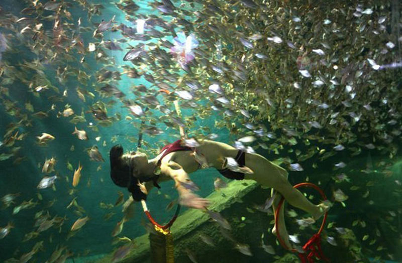 2011年2月3日,南通,南通海底世界演員首次為觀眾獻上“紅鰭銀鯽群游共舞”表演賀新春。