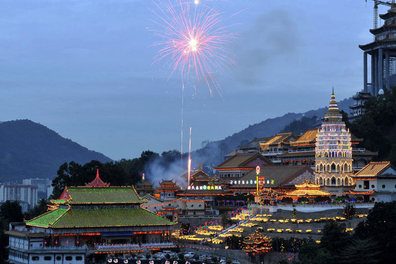 2011年1月29日,馬來西亞檳城極樂寺燃放煙花迎春節。