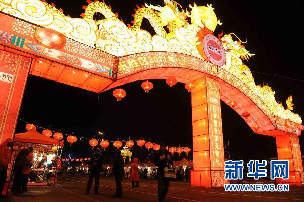 2月14日晚,參加“萬家樂”元宵文化節開幕式的市民走過花燈龍門。當日,為期五天的2011年“萬家樂”元宵文化節在內蒙古草原新城鄂爾多斯市東勝區拉開帷幕。 新華社記者張領攝