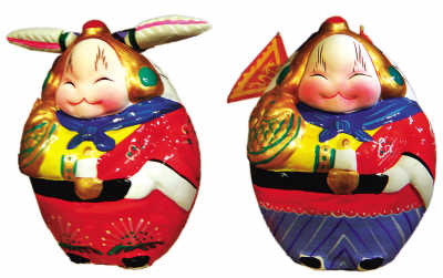 在胡鵬飛的工作室里,記者看到了各種各樣的新式兔爺。這些兔爺?shù)淖畲筇攸c(diǎn)就是微笑,傳統(tǒng)兔爺?shù)娜枳斐嗜切蜗蛳拢@得嚴(yán)肅威武,有的甚至比較猙獰;胡鵬飛的筆畫到三瓣嘴的末梢的時(shí)候向上一挑,便挑出了一個(gè)笑容可掬、親切喜慶的新版兔爺!用王連海的話說,這樣的兔爺正好象征著團(tuán)圓和氣、幸福美滿,也正符合我們這個(gè)時(shí)代的精神。