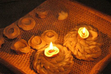 面燈也叫由面盞,是用面粉做的燈盞,多流行于北方地區(qū)。面燈的形式多種多樣,有的做燈盞十二斗(閏年十三只),盞內(nèi)放食油點(diǎn)燃,或?qū)⒚鏌舴佩佒姓簦暉舯K滅后盞內(nèi)余油的多寡或蒸熟后盞中留水的多少以卜來(lái)年十二個(gè)月份的水、旱情況,這在科學(xué)不發(fā)達(dá)的年代,其做法是可以理解的。如清乾隆年間陜西《錐南縣志》載牶“正月十五,以蕎麥面蒸盞燃燈,按十二月,以卜雨降。”表達(dá)了人們祈求風(fēng)調(diào)雨順的愿望。面燈在正月十六落燈之日煮或蒸而食之。目前農(nóng)村仍有此俗。