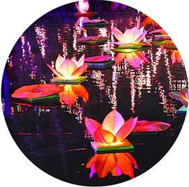 趵突泉的花燈早早地掛了起來,白天賞燈目不暇給、形態(tài)各異。待夜幕降臨、華燈初上,更是一番紅光綠影、恍若步入夢幻之境。徜徉在園內,水面、路旁、廊內處處都是燈與燈的光影。遠遠望去,那水中仿真的組燈作品“魅力世博”和“畫舫環(huán)城”栩栩如生,特別是那水中的倒影格外迷人。還有那雙耳豎立、齜牙咧嘴的“群兔鬧春”生動可愛,就連那花瓶中綻放的“梅花”也仿佛散發(fā)著淡淡的幽香……一盞盞瑩亮的荷燈在水面游弋,看得人心里好安靜,禁不住悄悄許下自己的心愿。