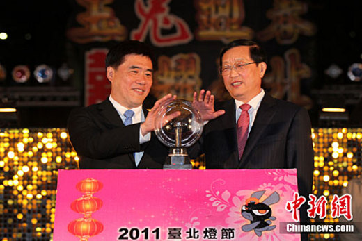 2月17日晚,作為2011臺北燈節(jié)特別活動,“關(guān)東風(fēng)情”在雨中閃亮登場。圖為遼寧省長陳政高(右)與臺北市長郝龍斌一起觸摸啟動道具魔球,啟動焰火及兩岸民俗表演。中新社記者 董會峰 攝
