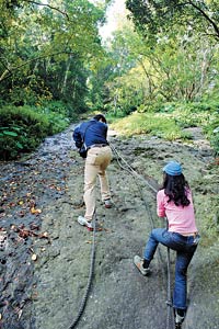 在“猴不爬”藝術(shù)林旁有個大巖壁,坡面傾斜度約40度,石壁上放著繩索,游客可拉著繩子攀巖壁,體驗當野人的樂趣。這片巖壁也一樣沒有名字,游人們就開始搞創(chuàng)意,并決定叫做“猴可爬巖壁”,因為想要攀上巖壁并不難,雖然這個名稱不特別稱頭,但總比"巖壁"二字來得花俏一點吧。