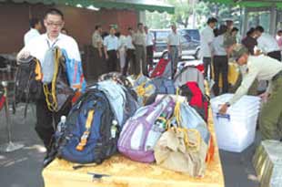 臺當局“總統府”開放參觀,入口安檢處擺滿不能攜入的大陸港澳游客包包。(臺灣《中國時報》圖)