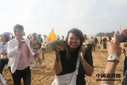 臺灣學生“蛋蛋”勇敢地和鱷魚合影