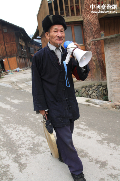 西江千戶苗寨中年級最大的鳴鑼響寨員,提醒大家千萬要防火(中國臺灣網 楊永青 攝)