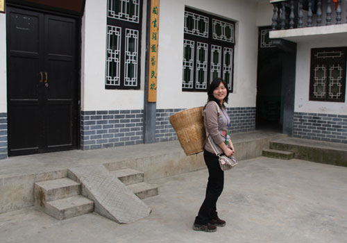 媒體記者在農家樂體驗背簍(中國臺灣網 李丹攝)